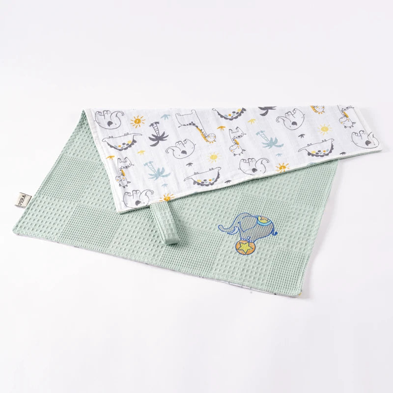• Blanket size 70 x 90 cm, double-sided. One side is muslin and one side pique fabric.