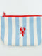 Capture the spirit of a seaside getaway with the PERA Nautical Pouch. This beautifully crafted bag is the perfect accessory for sunny days, coastal trips, or for adding a touch of maritime charm to your everyday style. Crafted from durable striped duck canvas fabric in classic blue and white, this pouch features a vibrant, embroidered red lobster as its playful and premium centerpiece. The design is thoughtfully accented with a bold contrasting red zipper, a full white interior lining, and a sturdy side loop with a gold-tone D-ring. Its spacious, stand-up design (flat bottom) provides ample room for your essentials, making it as practical as it is preppy.