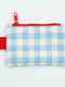 The perfect small pouch for your daily essentials. Features a light blue and white gingham pattern with a bright red zipper and matching red-lined interior for a fun pop of color. Matchy embroiodered carry all make up bag completes the set.